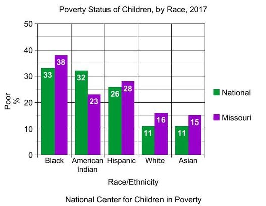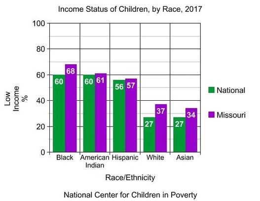 Children who are part of a minority race or ethnicity are disproportionately affected by poverty. Below are two graphs of the percentage of children of a particular race or ethnicity that are living in poor vs. low-income families in the U.S. Poor families are defined as having income below the federal poverty threshold, which for a family of four with two children was $24,858 in 2017. Low-income families earn less than twice the federal poverty threshold.